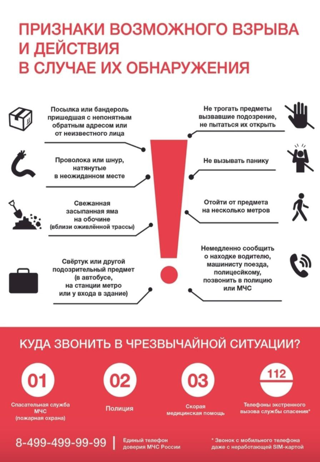 Основой обеспечения надежной защиты объектов с массовым пребыванием граждан от преступных посягательств является надлежащий контрольно- пропускной режим в сочетании с инженерно-технической укрепленностью и оборудованием системами охранной и тревожной сигнализации, видеонаблюдением. Руководителю объекта с массовым пребыванием граждан необходимо: 🔻•развернуть среди рабочего персонала, учащихся, студентов и преподавательского состава (участников культурно-массового мероприятия) разъяснительную работу, направленную на повышение организованности и бдительности, готовности к действиям в чрезвычайных ситуациях, укрепление взаимодействия с правоохранительными органами; 🔻•организовать пропускной режим в учреждение; 🔻•не допускать в образовательное учреждение, учреждение культуры посторонних лиц; 🔻•осуществлять ежедневный обход и осмотр территорий, помещений с целью обнаружения подозрительных предметов; 🔻•усилить охрану образовательного (культурного) учреждения (при отсутствии постоянной охраны, организовать дежурство преподавательского и обслуживающего персонала (работников учреждения культуры); 🔻•не допускать к проведению ремонтных работ рабочих, не имеющих постоянной или временной регистрации в данном регионе; 🔻•ежедневно проводить проверку подвалов, чердаков и держать их закрытыми на замок; 🔻•регулярно проверять состояние оконных решеток и ограждение территории; 🔻•с началом занятий (мероприятий) и по их окончании, входные двери держать в закрытом состоянии; 🔻•не допускать стоянку автотранспорта на территории образовательного учреждения; 🔻•обеспечивать своевременный вывоз твердых бытовых отходов; 🔻•контролировать освещенность территории учреждения в темное время суток; 🔻•проверять наличие и исправность средств пожаротушения и их готовность к использованию, проводить тренировки внештатных пожарных расчетов; 🔻•иметь в образовательном (культурном) учреждении план действий по ликвидации чрезвычайных ситуаций; 🔻•постоянно уточнять схему оповещения работников учреждения; 🔻•знать телефоны: отдела внутренних дел, противопожарной службы, «скорой помощи», службы спасения и аварийной бригады; 🔻•обо всех чрезвычайных происшествиях немедленно сообщать в органы правопорядка; 🔻•при обнаружении взрывчатых веществ (устройств), а также радиоактивных, химических и других предметов, представляющих опасность для детей, персонала (участников мероприятий) немедленно сообщить в дежурную часть полиции (по телефону -02); 🔻•организовать эвакуацию людей в безопасную зону; 🔻•принять меры к оцеплению опасной зоны, недопущению в нее людей; 🔻•по прибытии оперативной группы действовать в соответствии с ее указаниями. Категорически запрещается осуществлять какие-либо действия с обнаруженным подозрительным предметом. При обнаружении взрывчатых веществ или подозрительных предметов, в которых могут находиться взрывчатые вещества (дипломаты, сумки, коробки, пакеты), в целях предотвращения взрыва, необходимо выполнять следующие правила: 🔻•не пользоваться мобильными телефонами, электро-зажигалками и другими источниками огня или искра воспроизводящими предметами; 🔻•не трогать руками и не касаться с помощью других предметов; 🔻•не трясти, не бросать, не сгибать, не открывать; 